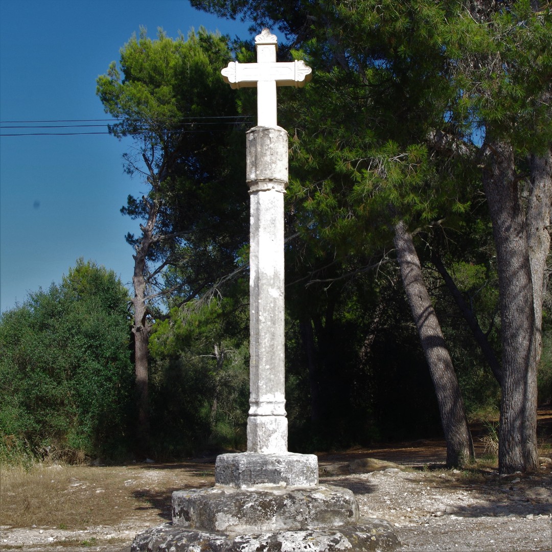 Der runde, stufenförmige Sockel ist schmucklos. Die Enden des lateinischen Kreuzes sind mit pflanzlichen Motiven verziert.