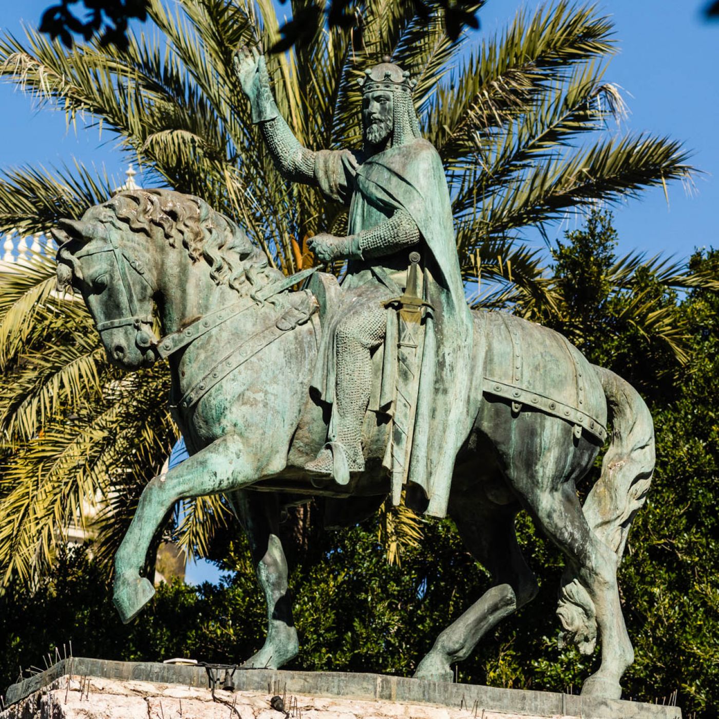 Die Reiterstatue des König Jaume I (Jakob I) steht an jenem Platz, an dem sich früher das Stadttor Porta de Santa Margalida befand und durch welches die Truppen von König Jaume I in die Stadt Palma eingezogen waren. Der Abriss des Tores führte zu einer Kontroverse, in deren Folge die Bevölkerung Geld für die Anfertigung des Denkmals sammelte und eine Ausschreibung für die Wahl des passenden Entwurfes veröffentlicht wurde. Zwar konnte sich Enric Clarasó anfangs nicht durchsetzen, war schließlich aber doch derjenige, der das auf einem Steinsockel stehenden Reiterdenkmal des Monarchen anfertigte, zu dessen Füßen sich die Figur eines Almogávar (katalanischer Soldat) befindet.
