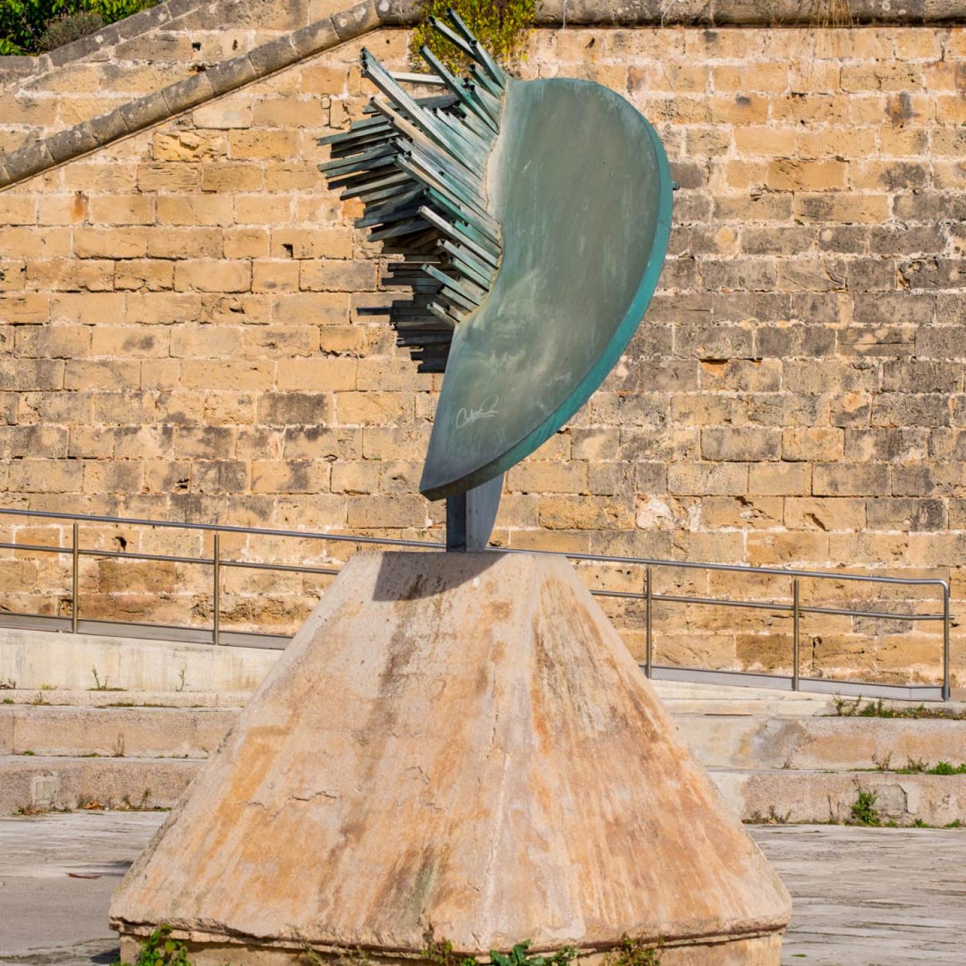 Esta escultura de Enrique Broglia fue regalada al Ayuntamiento de Palma en 1984. En la base tenía una inscripción que la dedicaba al 5º Centenario del Descubrimiento de América. La pieza está formada por un disco roto, de cuya fractura salen fragmentos que huyen de la forma original. Esta forma contrasta con la base de piedra, de estructura sólida y pesada.