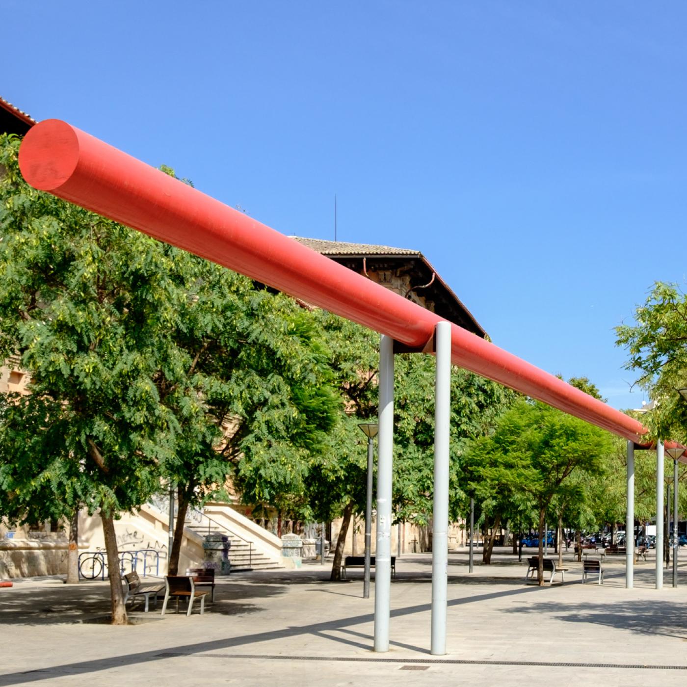 Esta se conoce popularmente como plaza del Tub por el gran tubo rojo que cruza en su centro. Este elemento arquitectónico se colocó a raíz de la reforma del espacio para convertirlo en plaza, que fue realizada en el año 1983 por parte de los arquitectos Pere Rabassa y Eugenio de la Fuente.