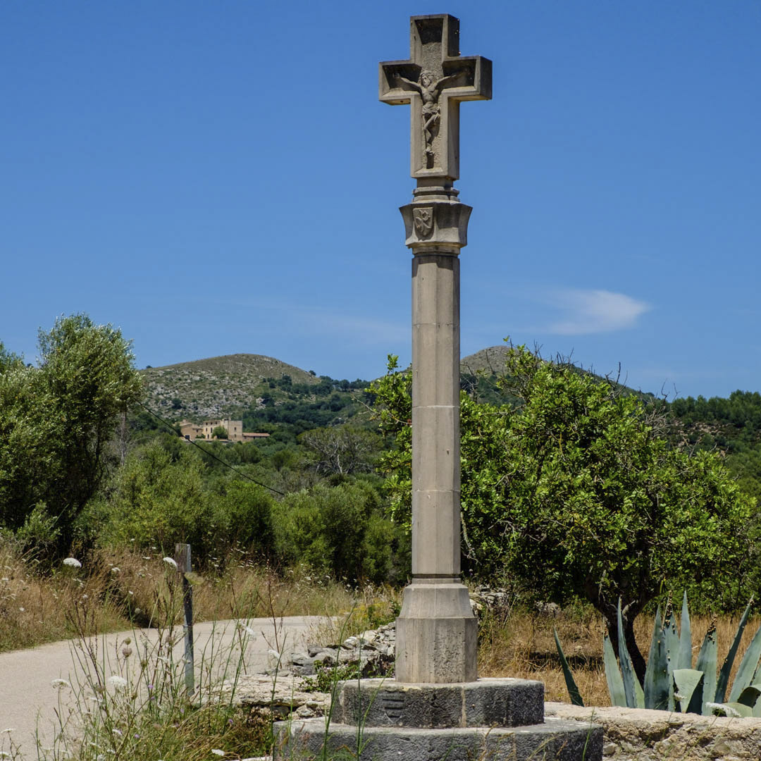 La cruz, situada en el camino que le confiere el nombre, está colocada sobre un podio escalonado en el que hay una inscripción, un escudo con tres franjas con flores de lis y la fecha 1939, que recuerda su construcción. El pilar es octogonal con un capitel en el que aparece un escudo con el emblema de Cristo. Lo remata una cruz latina con la representación de Cristo crucificado a un lado y de la Virgen María con niño en el otro.
