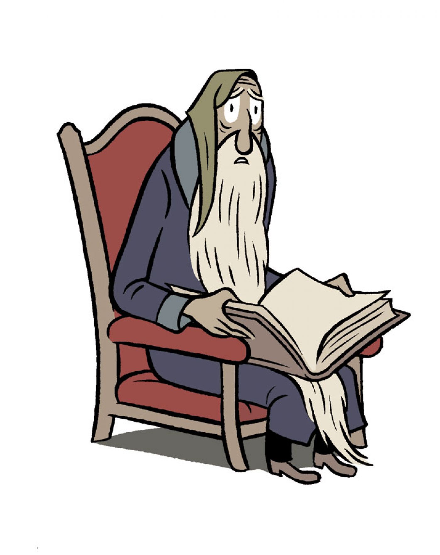 El nin s’acostà a una cambra i n’obrí la porta, que grinyolà feixuga. Allà dins, a la llum de l’espelma que portava, va veure un senyorot vell amb una llarga barba blanca, assegut en una cadirassa corcada entapissada de vellut color de sang. Amb el llum de l’infant, l’homenàs començà a llegir i llegir el llibre immens que tenia sobre els genolls. Fins que –al cap de molt de temps- digué: