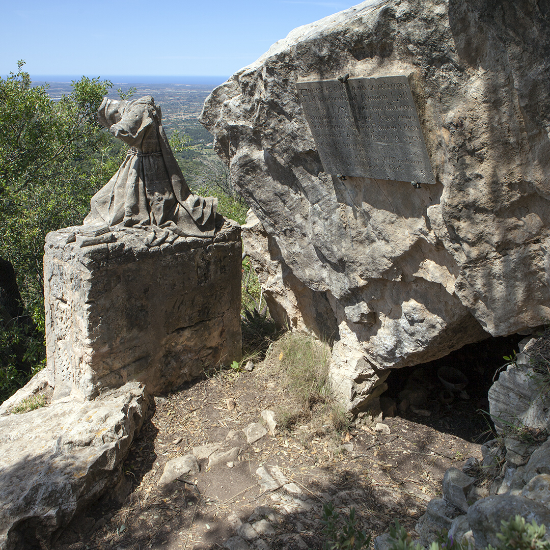 El tirayó puja bastant dret i, per uns moments, una mica esforçat. En 25 minuts sortirem a un camí de carro i voltam momentàniament a l’esquerra, per visitar la Cova del Beat. Segons tradició és aquí on Ramon Llull rebé la inspiració per redactar els seus llibres. Vora la cova veurem un gran arbust, verd i robust: és aquí el lloc de la llegenda coneguda com La Mata Escrita