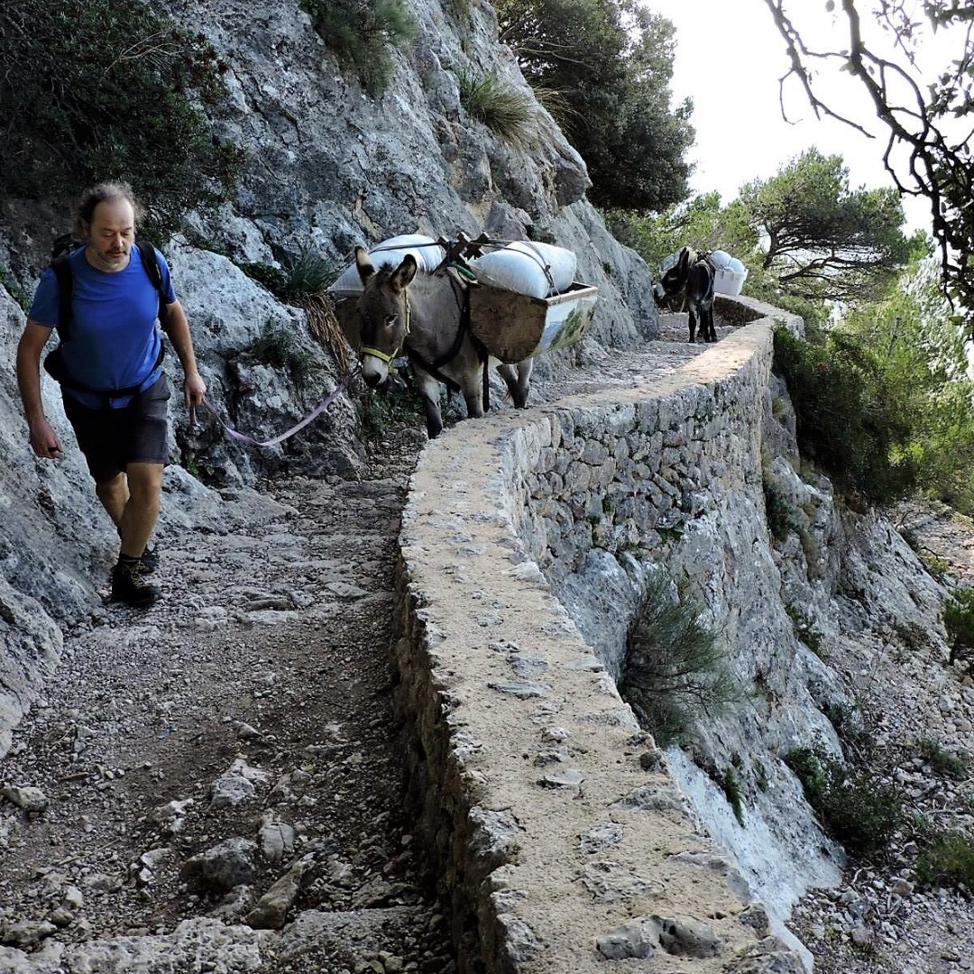 Després d’assaborir un primer tram de camí de ferradura, estret i empedrat, arribam a una cruïlla. Aquí, el nostre camí s’uneix amb el que ens arriba per la dreta i que puja directament des d’Alaró sense passar pes Verger.