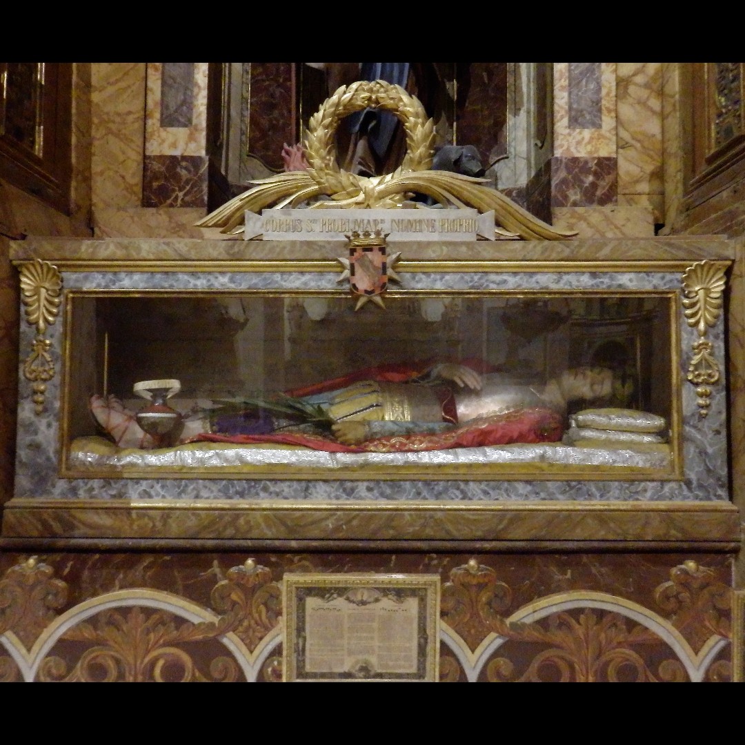 In 1847, the Marquis of Palmer donated a group of relics found in the catacombs of the Vía Tiburtina in Rome relating to the martyr known as Saint Probus. With them, sculptor Miquel Torres made a sculpture of a recumbent figure carrying a palm branch in his hand, an object used to characterize martyrs.